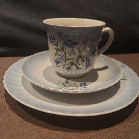 nederste er 15 cm i Ø, øverste asjetter er 11 cm i Ø. Har 2 stk. av de, pris kr. 300/fat