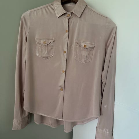Nydelig beige/shampagne rosa bluse selges billig. Silkeaktig i stoffet. Skinnkrage. Veldig lite brukt.