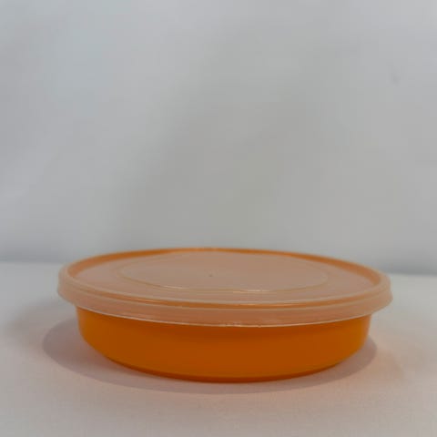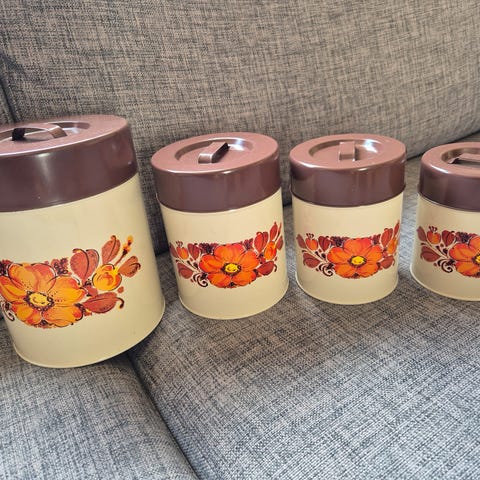 Kul retro boks med oransje lokk og oransje og gule blomster, litt bruksslitasje som dere ser på bildene.