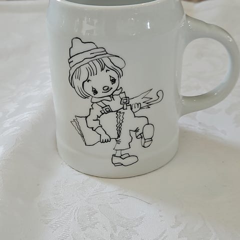 Porselen krus med lokk i metall, fine detaljer. (Germany), høyde: 12cm (uten lokk), diameter i toppen er: 6cm. Rommer litt mer enn 3dl. (Se gjerne mine andre annonser også)