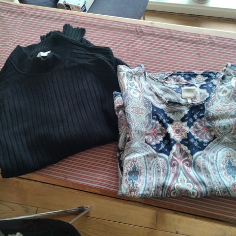 Selger 2 fine topper fra 'Lucky Brand', kortermet, sort topp er str. M, genser med åpen rygg er str. S, men begge er blitt litt brukt av ei som bruker str. S