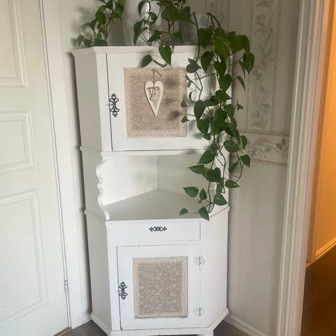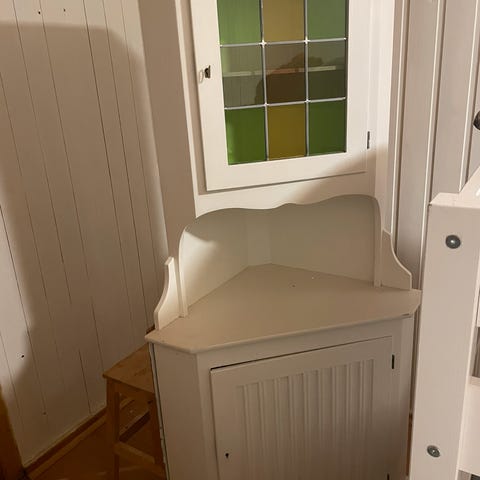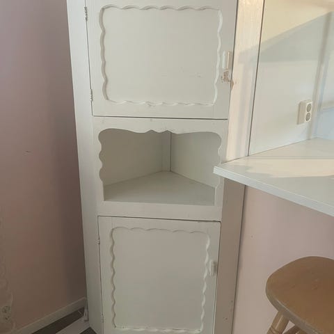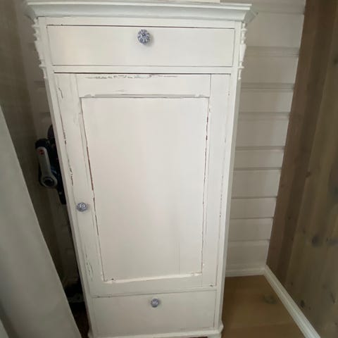 Nydelig skap med speil og flotte detaljer/utskjæringer. Trenger litt ny maling ol.