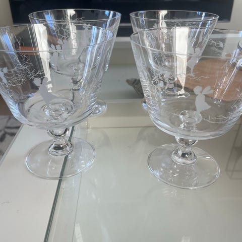 Seks stykk fine krystallglas frå Claddagh til sals. Disse er ikkje brukt og framstår som nye. Merket til Claddagh og blomster er inngravert i krystallglasset og ein må ut med rundt 3000,- for tilsvarande glas på sidene til Claddagh i dag. Ta kontakt om du ønskjer fleire bilete. Prisen er diskuterbar.