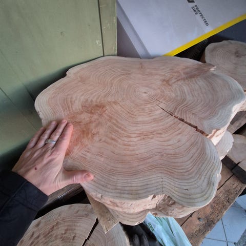 Ukjent merke Kabel trommel Bord med integrerte LED-lys. og glassplate. Bordet er laget av tre og med tau utvendig, med en rund form og glassplate oppå. LED-lysene er farget og plassert rundt bordets overflate, noe som gir dekorativ belysning. Passer til bruk som et unikt og rustikt møbel i hjem eller hytte.