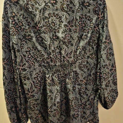 Kul boho jumpsuit fra H&M. Svart med små stjerner. Strikk i livet. Lukkes med små hekter foran. Rysjer ved ermene. 88 cm målt fra skuldersøm og ned på baksiden. Ingen bruksspor.