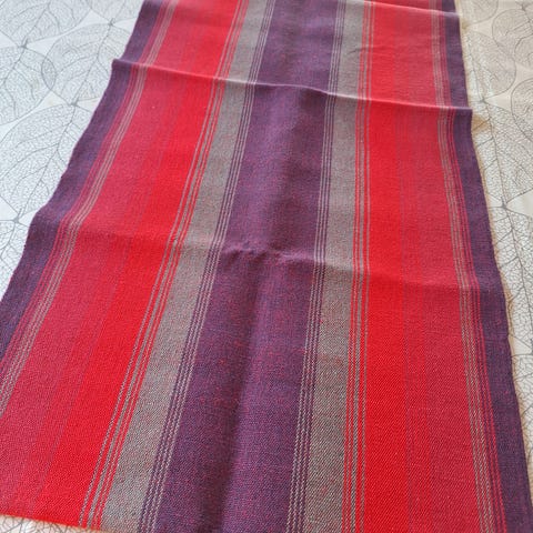 Ei lita bit av silke med særpreget mønster. Litt usikker på opprinnelse, sannsynligvis håndvevd Mudmee eller Ikat fra Thailand. Kjøpt på 80-tallet til et eller annet formål. Trolig ment for en sarong ettersom det er forskjellig mønster langs sidene.