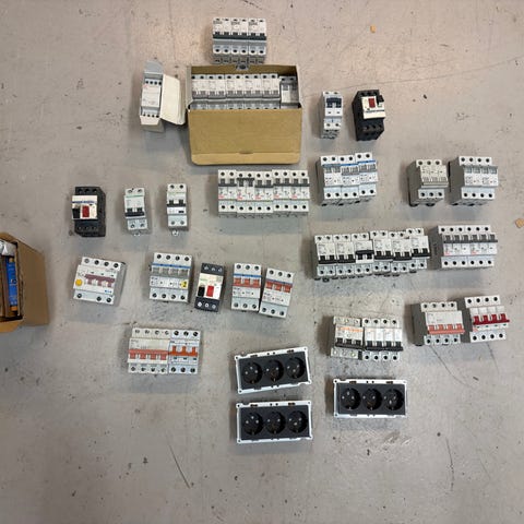 Komplett strømsøyle ÷ stolpe. Kontakter 3/32A og 2/16A og tilsvarende jordfeilautomater til stolpe. 50A sikring og 100mA jordfeilbryter for tilkobling i sikringsskap.