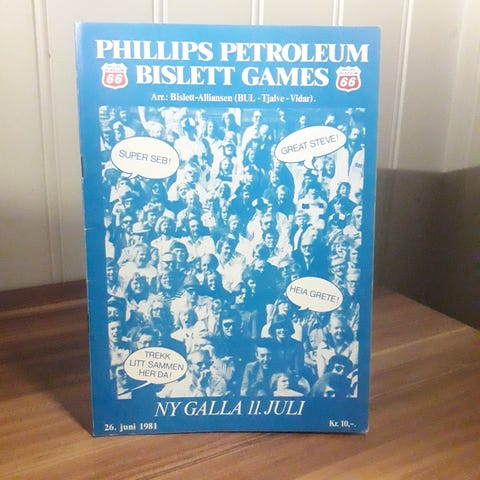 Med program og to poser med en bit av gamle Bislett!