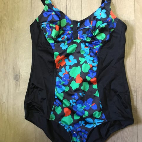 Nydelig badedrakt med gullring i front. Str 44. Veske i silkestoff i samme mønster. Bare prøvd på, aldri brukt da den ble litt for stor.