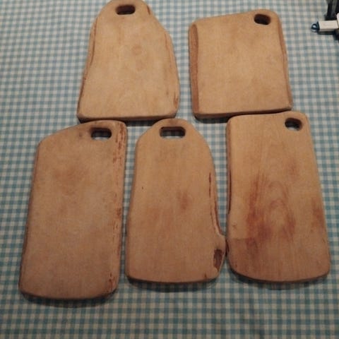 Solide 3 cm tykke fjøler i tre med saftrenne og utskåret håndtak på undersiden.