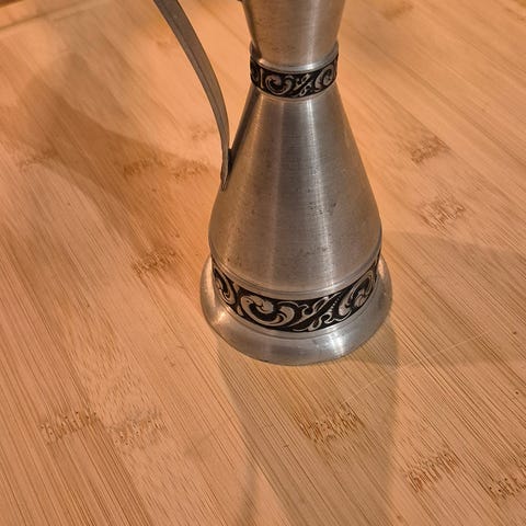 Pen kanne i tinn selges for kr 100. Høyde 25 cm. Merket Norway Pewter.