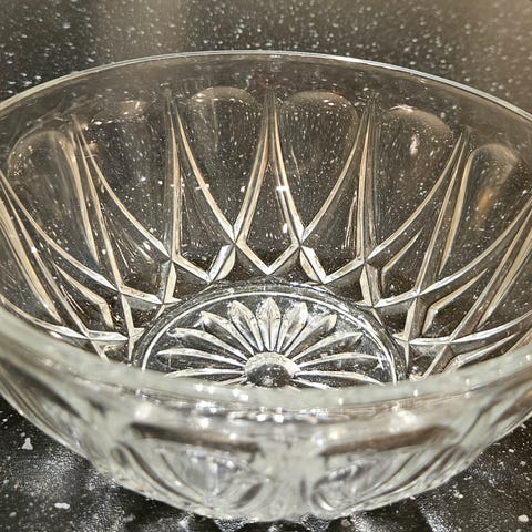Nydelig gammel pressglass skål med lokk. Det er drueranker øverst på glasset. Vinbladene er matt glass. Dette er et kraftig glass.