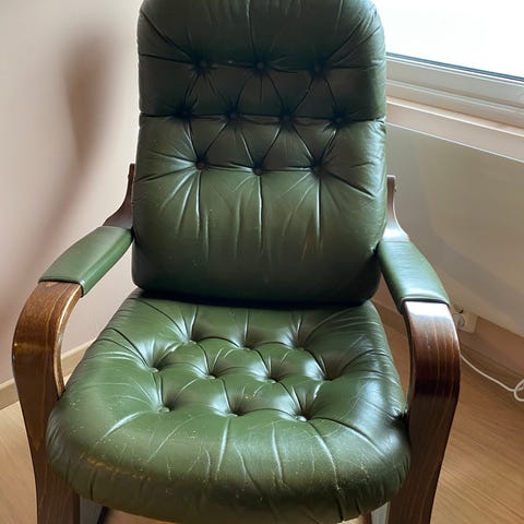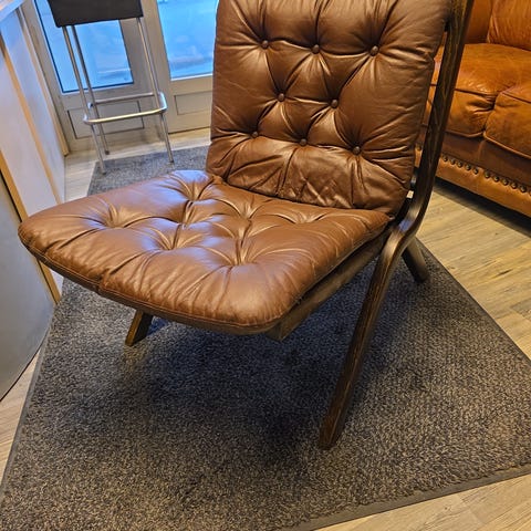 Skinnet har tydelig bruksslitasje, men ingen hull eller rifter. Rammen i teak er i god stand, med jevn farge og fin glød. Stolen er solid, stabil og fortsatt komfortabel å sitte i.