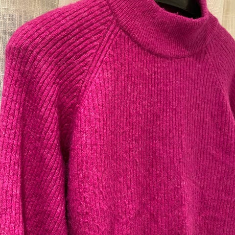 Rituals genser, str. S (passer M). Ullblanding flette strikk i Burgundy med glitter tråd.