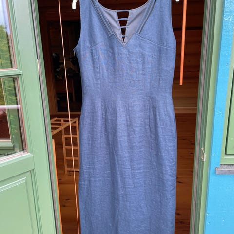 Figurnær kjole i 100% linen (lining i bomull/polyester), med glidelås på siden. Rolig blå farge, ganske mørk men ikke typisk navy. Meget pent brukt.