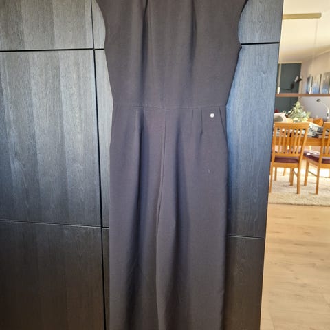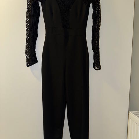 Lekker buksedrakt i svart, nydelig gjennomsiktig blondemøster øverst på drakten, helt strøken, fremstår som ny.