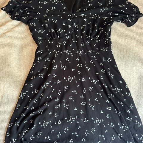 Feminint modell med litt puffetmer, bånd under brystet som knytes i ryggen for markert midje og utsvingt skjørt.
