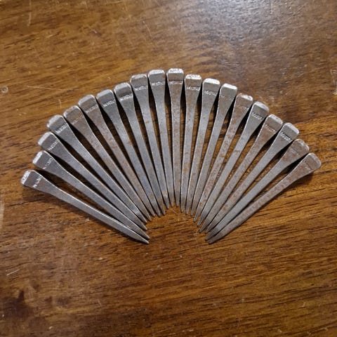 10 stk. gamle ubrukte smidde spikre. Lengde 62 mm (2,5 tommer). Har flere hvis det trengs. Fine til bl.a. restaureringsarbeider. 49 kroner for 10 stk.