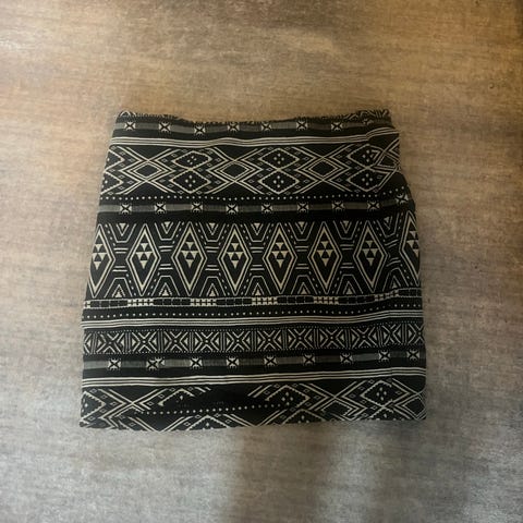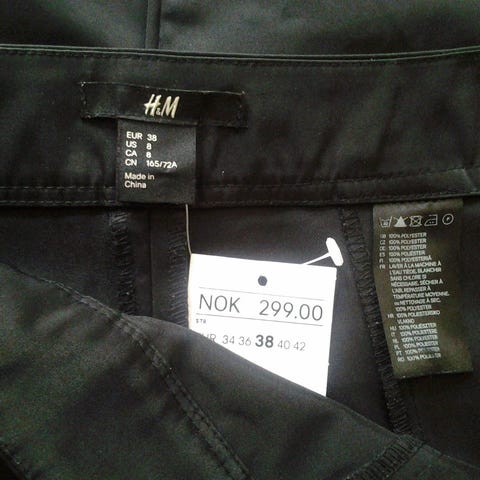 Tungt stoff som faller pent. Mye stretch. Midjen er 40 cm x 2, lengde er 46 cm.