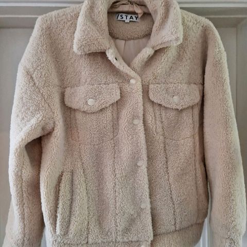 Teddystoff jakke, str. S. Kr. 150. Fin som høst eller vårjakke.