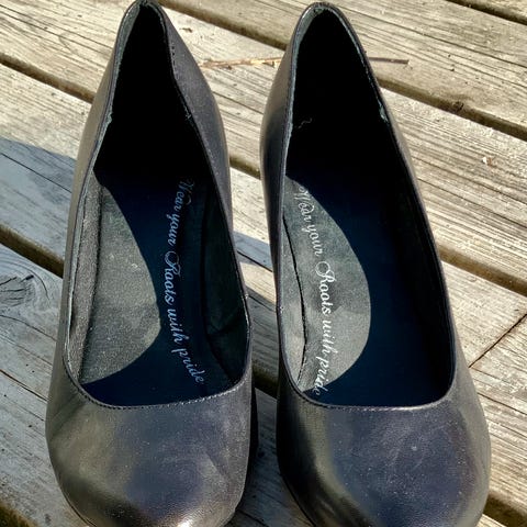 Semsket skinn fra Next, indre mål langs sålen ca 23 cm, dropp på hælen ca 6,5 cm pga ca 1,5 cm platå foran. Lite brukt.