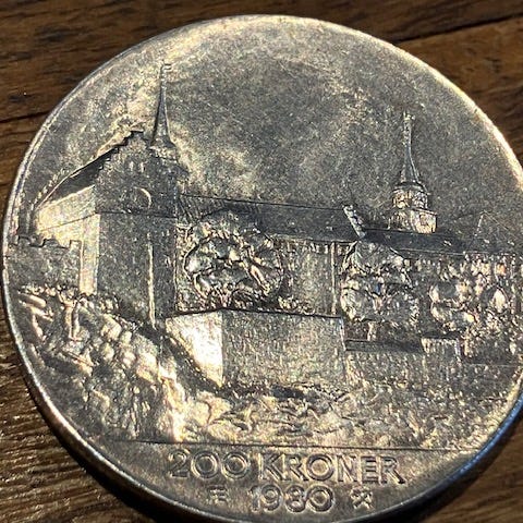 Denne mynten veier 27,3 gram og inneholder 17,06 gram reint sølv.