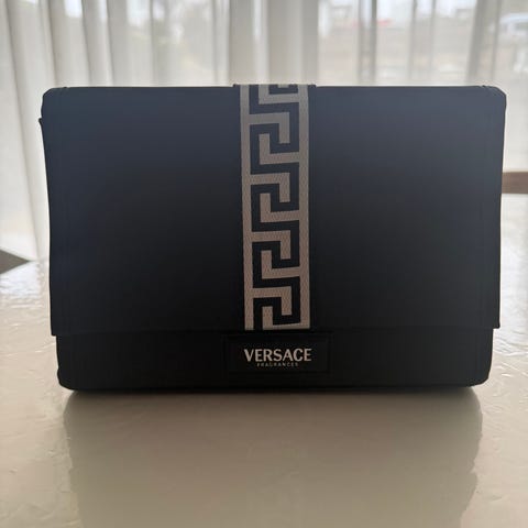 Selger en ubrukt sminkepung fra Versace. Plasten sitter fortsatt på. Flott størrelse som rommer mye. Måler 22x15x7 cm. Kan også brukes som clutch 🤩 Sommerlig og flott!