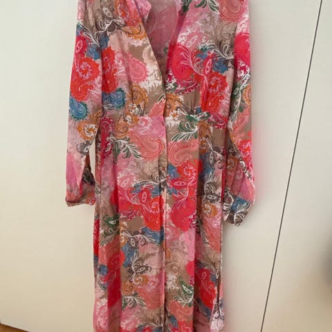 Kjempefin kappekjole med v-hals og vide armer. Kjolen er i tynt stoff og underkjoler følger med. Kjolen har en dyp grønnfarge med korall og eplegrønt print. Kjolen passet en 36-38.