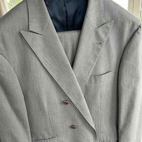Strøken vår/sommer dress fra eksklusive Canali i lys sand/beige farge. Super 120s 100% ull. Str 50L (50 ekstra lengde) med klassisk passform og dobbel snitt på baksiden av jakken. Matchende Cerruti slips følger med. Kun brukt en gang i bryllup og er som ny.