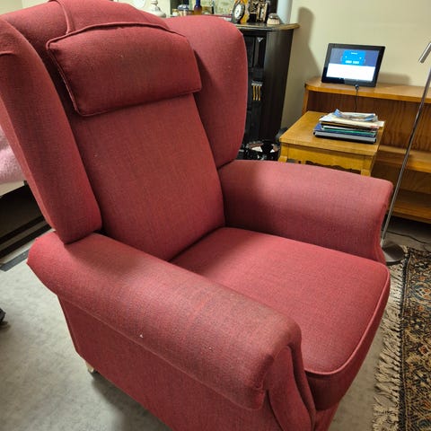 Klassisk ørelappstol – komfortabel og stilren. Selger en pen og komfortabel ørelappstol i nøytral brun/grå farge. Stolen har høy rygg og gode armlener som gir god støtte