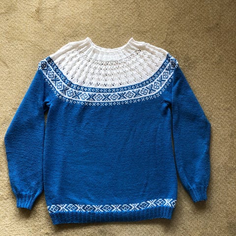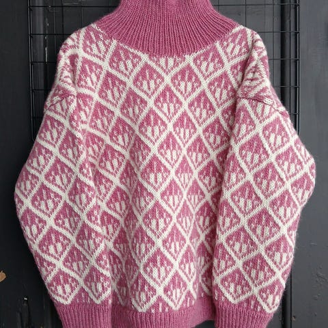 Nydelig hjemmestrikket genser i str 40, selges for kr 700,-. Genseren er strikket i Bjørk Viking garn. Den er ny og ikke brukt.