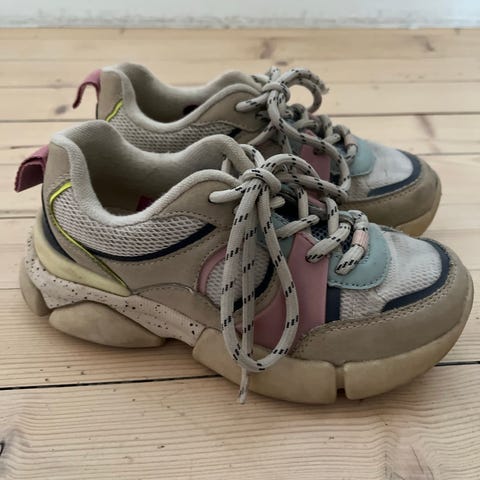 Zero joggesko med Gore-tex selges. Fargen er har blitt noe beige og striper på det hvite på sålen. Det er mye skobruk igjen. Selges da de har blitt for små.