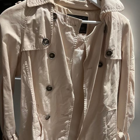 Hvit, røff dongrijakke med belte, og mange lommer - fra Kappahl, str 36-38 🤩💫 Kjempe fin som vårjakke, lite brukt og i fin stand. Selger fordi den kun blir hengende i skapet