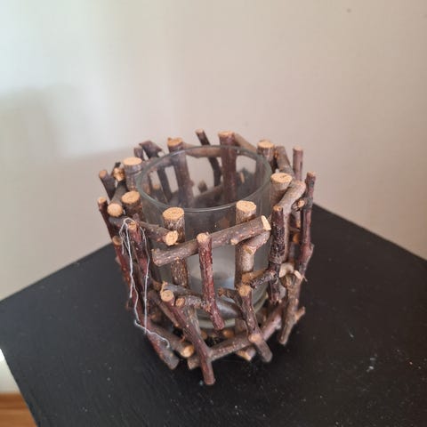 Treet kan oljes med vanlig treolje eller matolje ved uttørking. Passer til vanlige kronelys. Lengde 43cm, bredde 16cm, høyde 11cm. Laget av Margoter og nikkel.