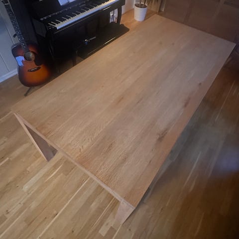 Bordplaten har en del skjolder og noen bruksmerker. Bordplaten er oljet, men det har ikke blitt fulgt opp den siste tiden. Egnet olje kan følge med. Bordet er ble kjøpt i massivt tre for å kunne slipes. Dette har vi enda ikke gjort.