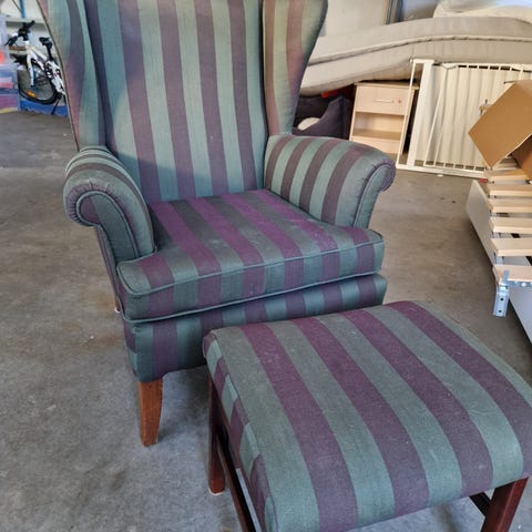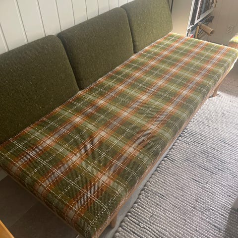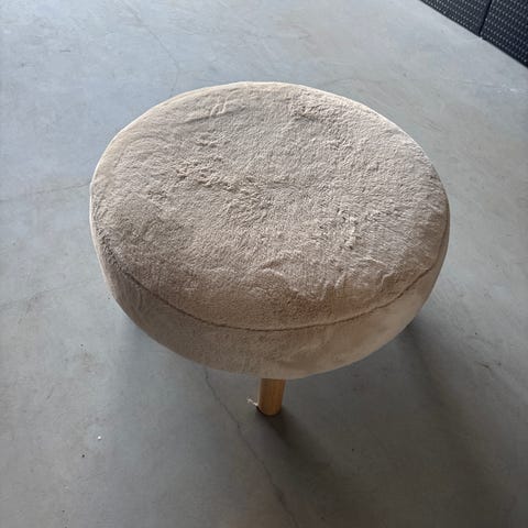 Lokket er 38 cm i diameter. Den er 39 cm høy med lokk og ben. Teak i bena. Tror det er skai i puffen. Liten flekk, se bildet. Den er nok fra 1960 tallet.