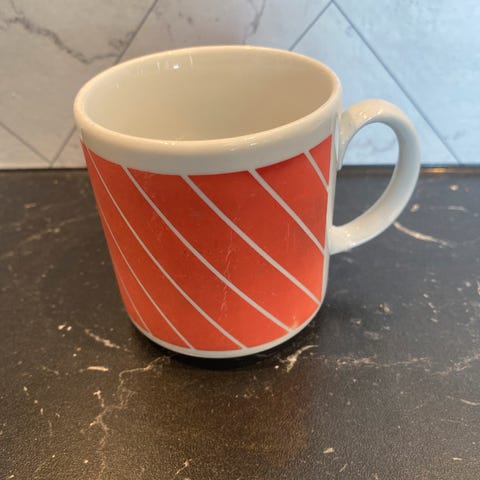 Ingen synlige skader. Ser noen «ganger» i glasset, men tror det er fra produksjonen. Kjenner ingen sprekker med neglen mot glasset. Hører ikke noen «knust» lyd i koppen. Pent brukt til å være vintage/gammel.