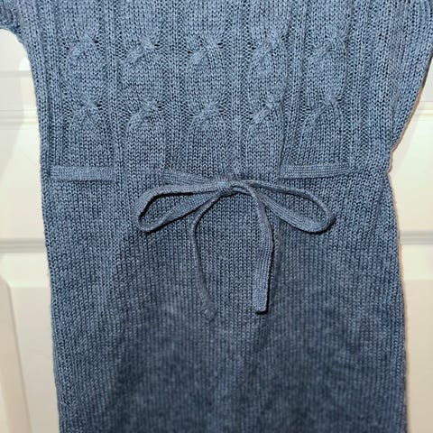 Ny håndstrikket kjole i marineblå bomullsgarn fra Hjertegarn. Med klassisk flettemønster.
