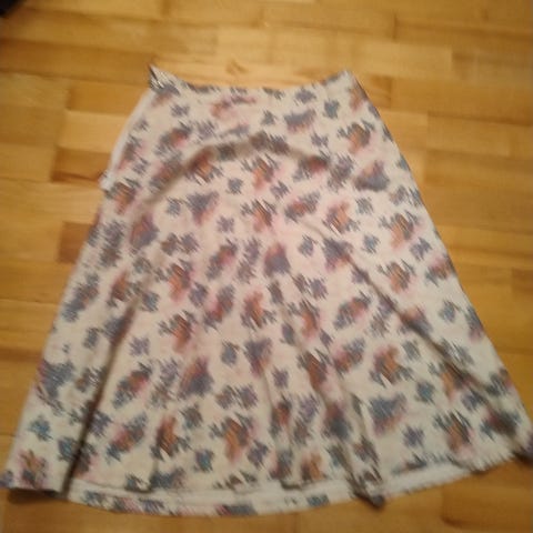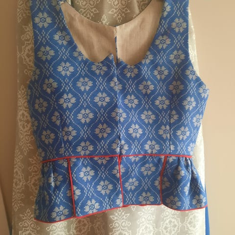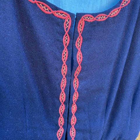 Håndsydd kjole ( Fryvil) med fine detaljer, heklete blomster og et lite vers nederst på kjolen . Størrelse 38.
