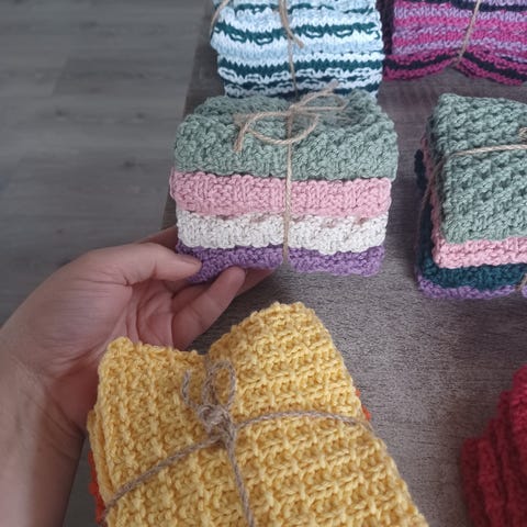 To nystrikkede vaskekluter. Helt nye, strikket nå.