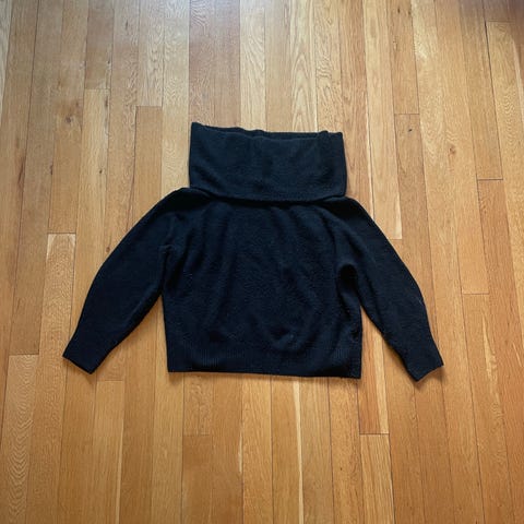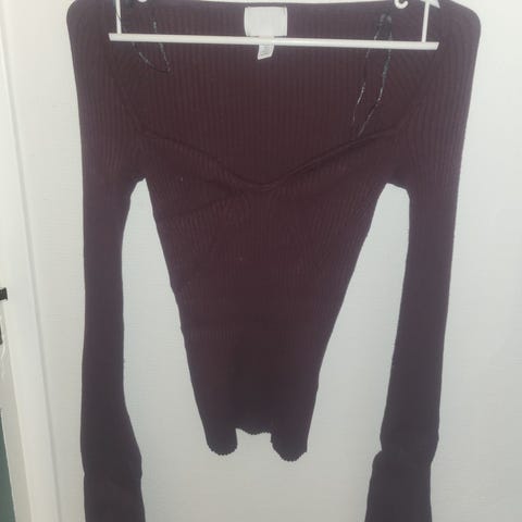 Fin genser med bare skuldre og splitt i sidene nederst. Fargen er burgunder som du ser på bildet. Altså blanding av brun og rød. Ser pen ut på og er pent og lite brukt. Den er blitt litt liten til meg og derfor selges den.