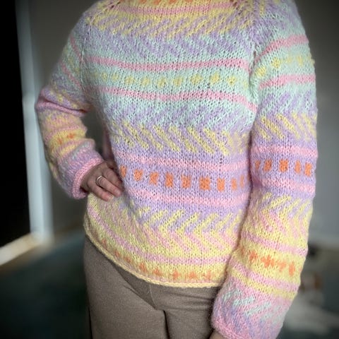 Klassisk hjemmestrikka genser i tjukk italiensk naturfarga ull. Genseren er ubrukt, kun prøvd på for bildetaking. Strikkemetoden gjør at den strekker seg og tilpasser seg personen. Dessverre ble den litt for liten for meg. Personen på bildet er str M. Kan passe S/M 36/38/.
