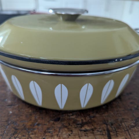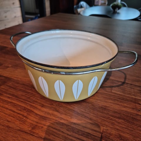 Kasserolle med en hank, diam. 18 cm noen skrapemerker i bunden, selges kr 175,00