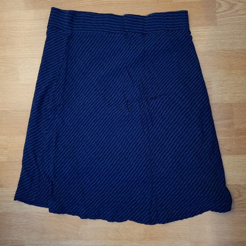 Blått skjørt med hvitt mønster. Behagelig skjørt med strikk bak i linningen. Tynt og godt stoff. Lite og pent brukt.