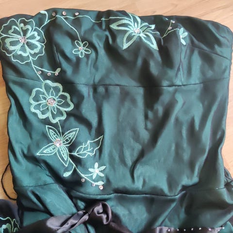 Utrolig fin kjole i sort farge med grønt blomster og blad mønster.