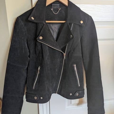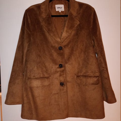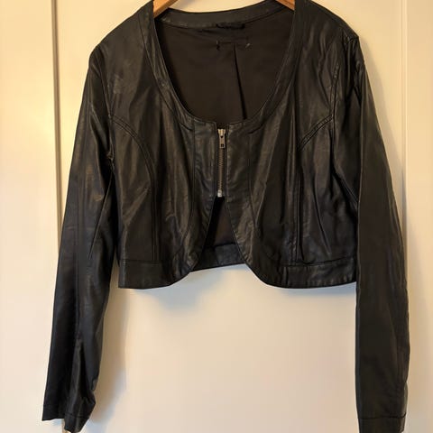 Croppet jakke i semsket skinn-imitasjon / faux suede. Veldig myk og behagelig kvalitet. Fin å bruke over kjoler eller løse skjorter til f.eks. jeans. Eller som en kul kontrast til søtere plagg. Pent brukt.