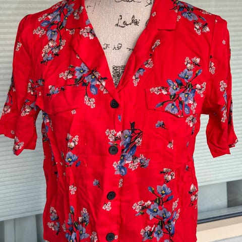 Blusen er en stor M, liten L (Litt i grenseland). Veldig kul bluse i rosa-fersken farge. Knappene er som sukkertøy. Kan hentes i Stavanger.