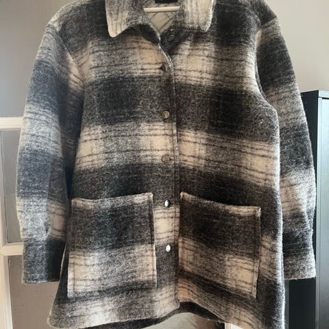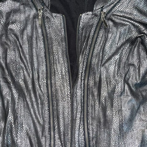 Selger svært pent brukt sølvfarget jakke. Står størrelse 40, men er liten i størrelsen. Merke: Pyramid. Lengde fra skulder og ned: 60 cm. Lett innsvinget. Jakken er i tynt bomullsstoff med sølv ytterside.