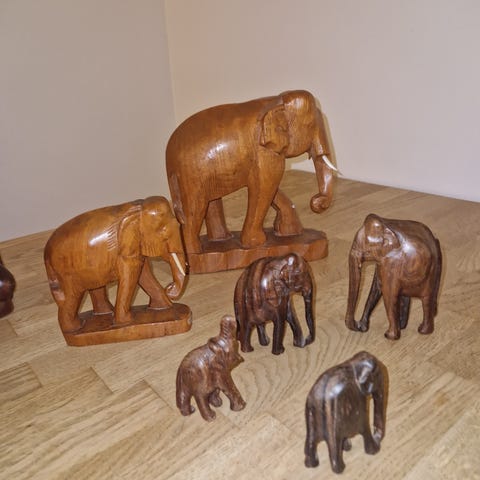 To stykk elefanter skåret i mangotre. 11 og 17 cm høye. Hele og pene. Selges samlet