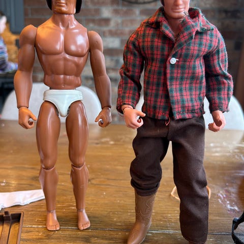Den ene er en Big Jim 1971 fra Mattel , han har på seg en mc dress , har funnet ut i fra eBay .